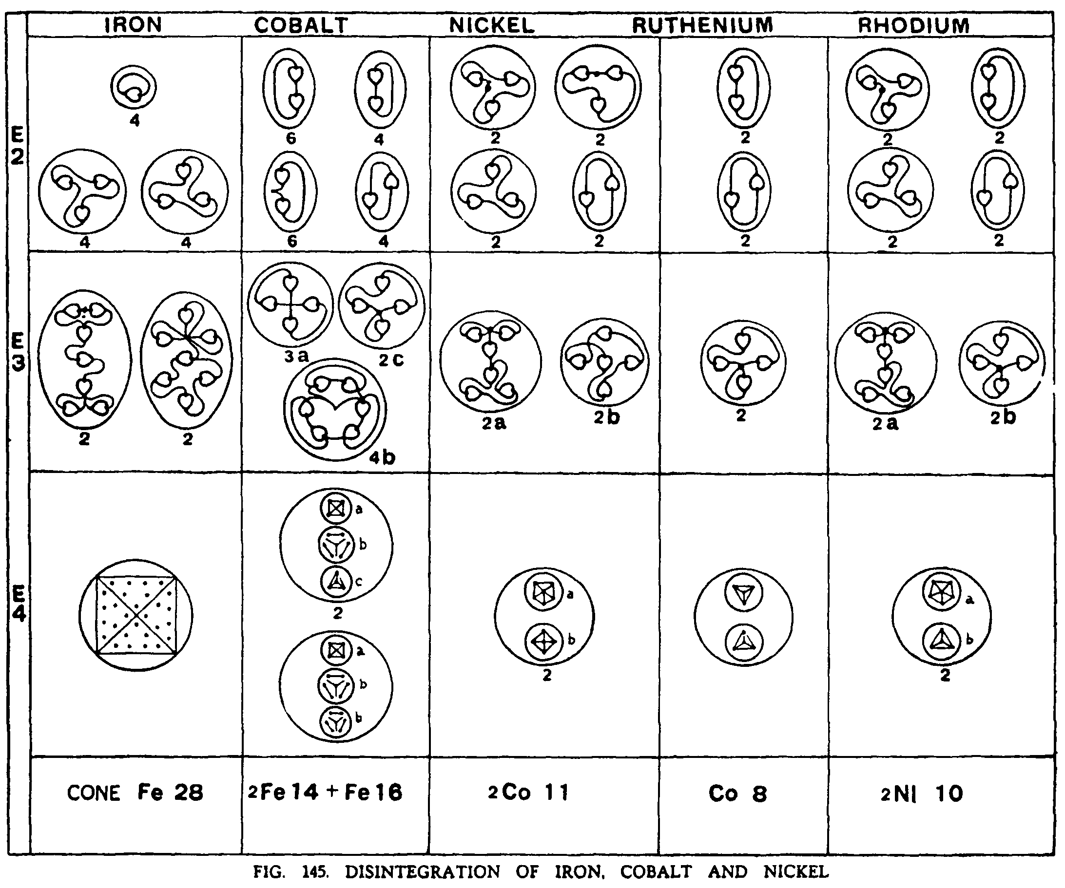 It will be noticed that each bar has two sections, and that the three lower sections in Iron, Cobalt and Nickel are identical (2Fe14+ Fe16). In the upper sections Iron has a cone of twenty-eight Anu, Fe28, while Cobalt and Nickel have each three ovoids, and of these the middle ones alone differ, and that only in their upper globes. this globe having four Anu in Cobalt and six in Nickel.