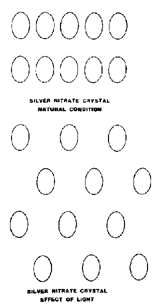 Fig. 215 illustrates the effect produced by light on the arrangement of the molecules. In the normal crystal the molecules are in rows. Light alters their position so that they are as in the diagram. The alternate molecules step back. Evidently the light is absorbed and not reflected.