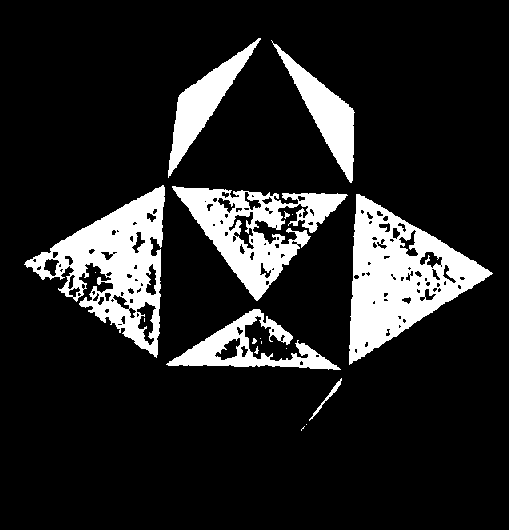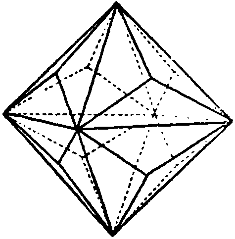 When examined clairvoyantly it was seen that the structure of the Diamond was somewhat difficult to grasp. There was clearly a unit of Diamond, and its shape was a triakis octahedron. Fig. 216. But how was the large mass of Carbon atoms built up to make the Diamond? Each Carbon atom is an octahedron in outline; each is composed of eight funnels, four positive and four negative. Obviously in any form of packing, funnels of like electrical quality must not come mouth to. mouth, as they will then repel each other.