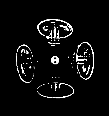 One especial difficulty in mapping out the structure of the Diamond was due to the fact that in reality there is no rigid octahedral shape visible in the outline of a Carbon atom. Certainly its eight funnels radiate to the eight surfaces of an octahedron; but the octahedral shape is more an appearance than a reality. Fig. 217 shows four of these funnels. The funnel is a temporary effect, being in fact the rotational field made as groups of Anu revolve. In their revolutions, they push back the circumambient matter of the plane next above, making thus a temporary shell or field of activity.